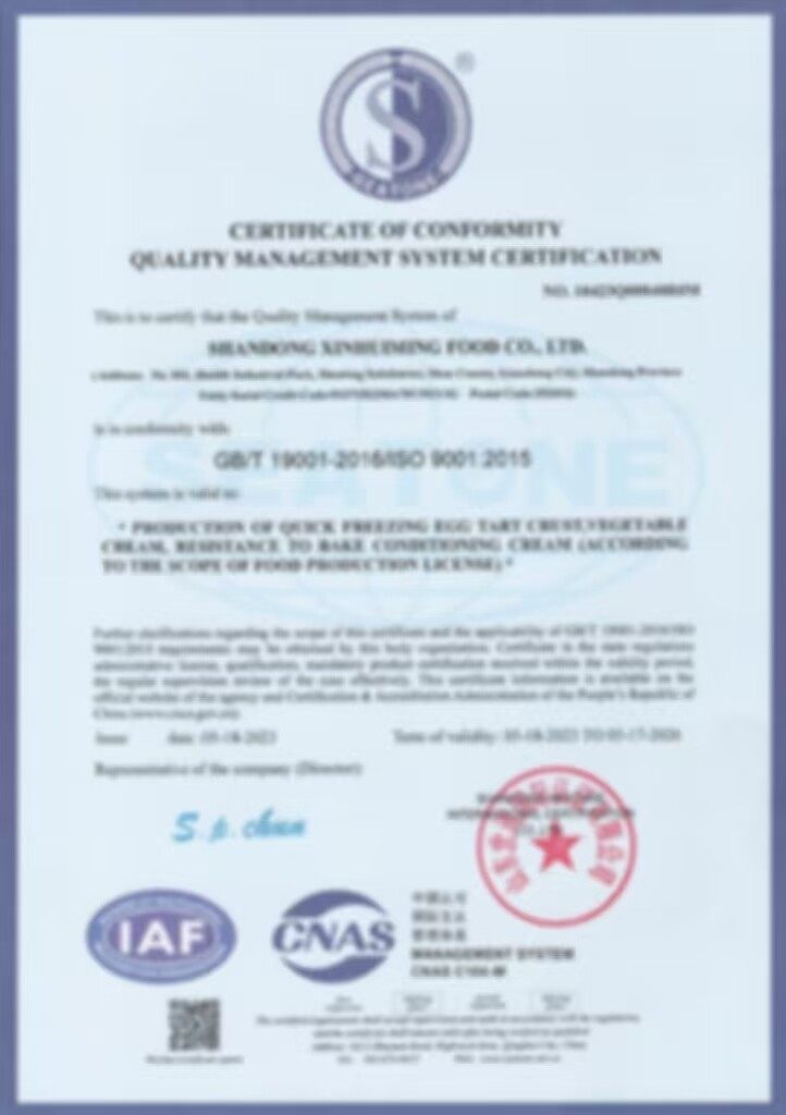 The cream production line uses EU milk source refined high-milk fat base, the wheat cake production line uses a 36-hour low-temperature fermentation process to create crispy biscuits, and the egg tart production line restores the freshly baked flavor with 192-layer hand-opened crispy technology. The three production lines share the R&D center and ISO22000 quality control system, standardized management from raw material processing to finished baking, with an annual production capacity of more than 10,000 tons, providing global customers with authentic, safe and healthy bakery products comprehensive solutions.